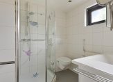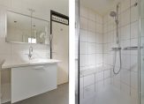 – Luxe en geheel betegelde badkamer, voorzien van een fraai wastafelmeubel, wandcloset, en een douchecabine.