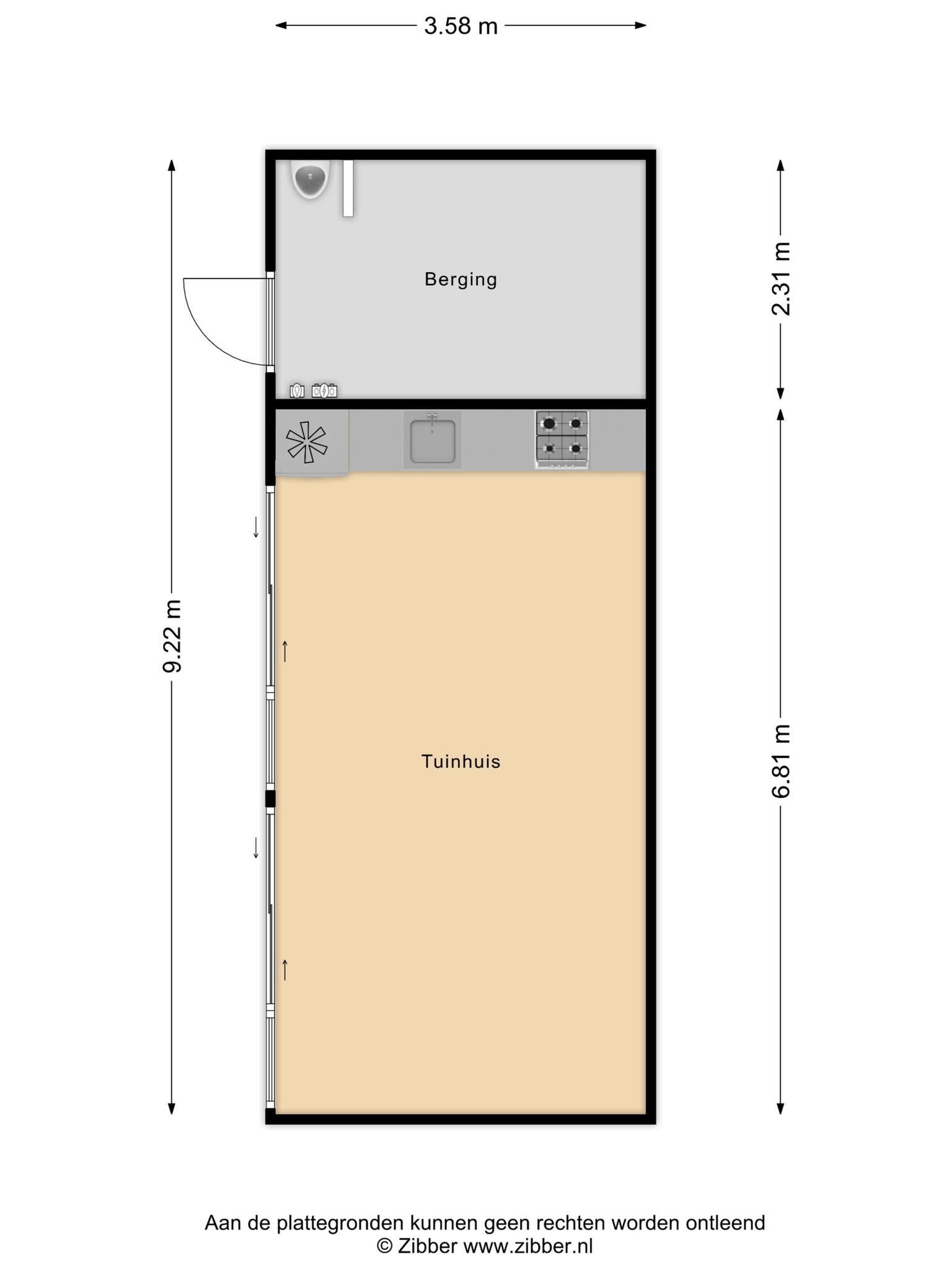 – Houten tuinberging (afmetingen binnenwerks: circa 2,31 X 3,58 m¹) met een extra groepenkast en een urinoir.